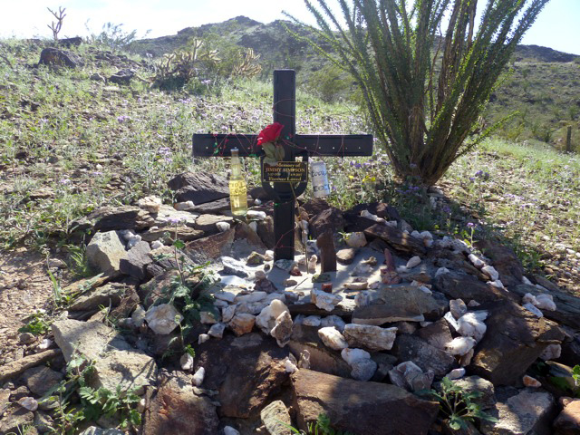 The guys have two-way radios and one with us at our set-up location relays direction from Mason to those riding: “Okay, turn around and come back, just like that.” “Wait there a minute for the dust to settle.” “Follow each other a little closer next time.” “Don’t follow so closely.” It’s warmed up a bit so in between takes those of us not busy with re-locating tripods or changing memory cards or batteries seek out the shady side of the trucks; often sitting by a wheel to keep the sun off of us. No more roadrunner pose to soak up the warmth; now be still in the shade like javelina. During one of these lulls and a snack break, I glance to the side and see a reflective glittering up the hill. I walk up and it’s a cross, with an “in memory of” plaque, a bottle of Corona, a horseshoe, a rose: a shrine. These sorts of memorials are common in Arizona—an artifact of Mexican Catholicism, I’m told. The folklore history is that they mark the location of a sudden death—so sudden that last rites could not be administered and so the deceased’s soul is in Purgatory, needing prayers from the living to gain entrance to Heaven. Many of these shrines are on roadsides. Historically, Apache raiding parties were the bringers of sudden death; now motor vehicle accidents. I’ve noticed variation in extravagance among shrines and think the custom may be evolving/morphing into remembrance—or a marker at a favorite place with artifacts of favorite activities.